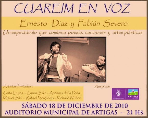 El compositor artiguense Ernesto Díaz que cuenta con una larga trayectoria, presentará algunas de sus composiciones en Portuñol, y el poeta Fabián Severo, autor de Noite nu Norte, que acaba de ganar el Premio Morosoli, leerá algunos de sus poemas.